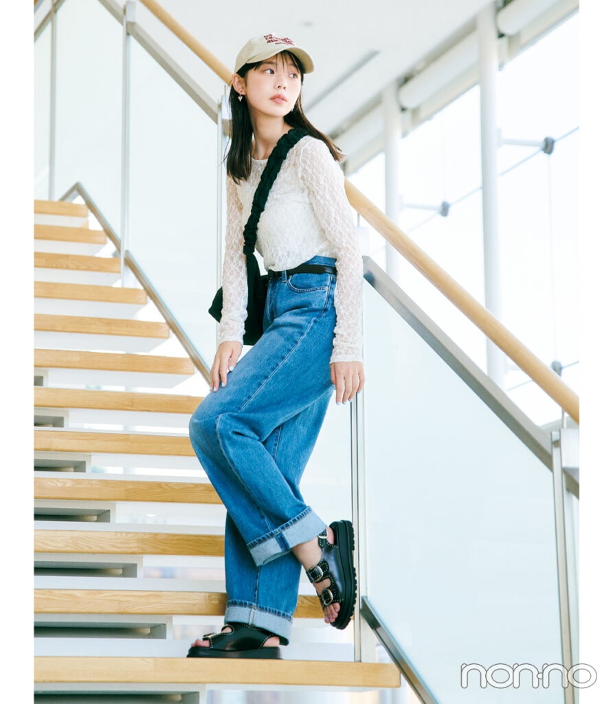 たくさん歩くお買い物の日は、定番デニムにカジュアルにもキレイめにも合わせやすいベルトサンダルを合わせて出発! カジュアル要素強めのアイテムが多い日には、レーストップスで甘さを一さじプラス。ロゴ入りのキャップを合わせて、しゃれ感も紫外線対策も手に入れて♡