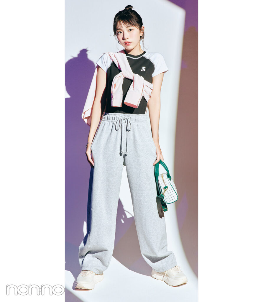 土曜日は、スポ要素全開のTシャツ×スウエットのアクティブコーデでジムへ出発。柔らかカラーのランニングシューズと同系色のシャツをたすき掛けしてこなれた雰囲気に♡ さらにグリーンのハンドルが目を惹くミニバッグを合わせて、差し色+コーデの引き締め効果を狙ってみて。