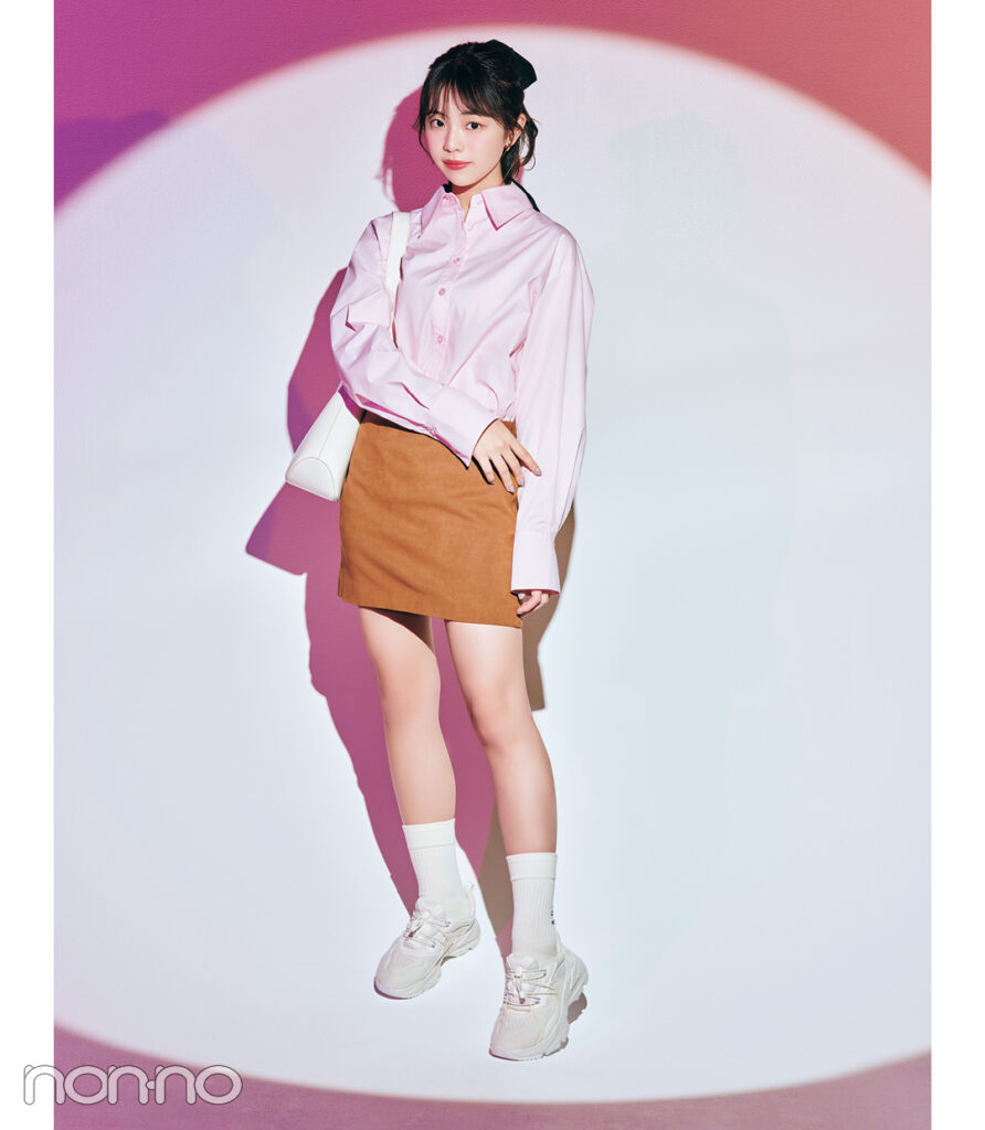 火曜日はサークル活動の日! 春らしいピンクシャツ×ミニスカの動きやすい甘カジュアルな着こなしで出発。露出多めなミニスカには、脚をキレイに見せてくれるボリューム感のある白スニーカーが相性抜群でおすすめ♡