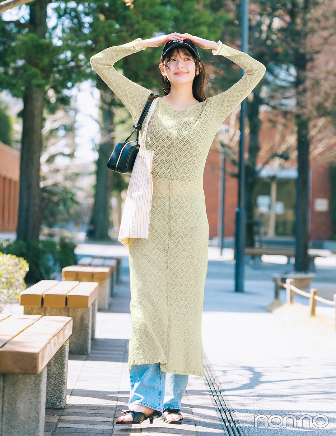 春めくライムグリーンの透かし編みワンピで、気持ちも軽やか&ハッピーに♪ 中にタンクを仕込んでおくと透け感アイテムも安心。ワンピの裾からブルーデニムをちらっと見せることで、奥行きのあるカジュアルコーデに着地。