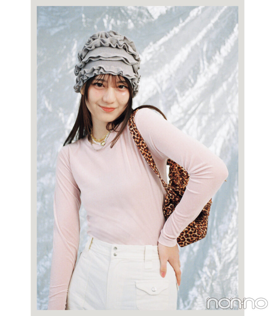 トップス¥8800/ユー バイ スピック&スパン ルミネ池袋店(ユー バイ スピック&スパン) パンツ¥13200/バロックジャパンリミテッド(LAGUA GEM) 帽子¥5500/レイ ビームス 新宿(レイ ビームス) ネックレス(シルバー)¥3300/ロードス(TIGRIS) ネックレス(ハート)¥33550/KNOWHOW jewelry ネックレス(ゴールド)¥3300/サンポークリエイト(アネモネ) バッグ¥2990/GU