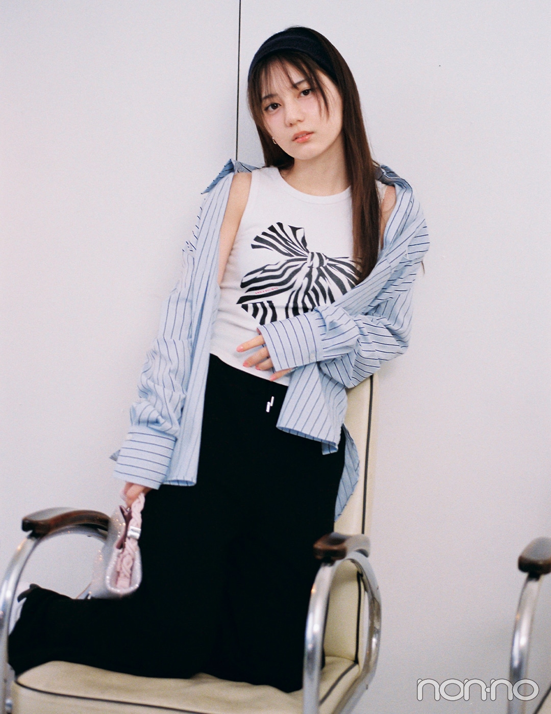 爽やかなブルーのストライプシャツにはヘルシーなタンクトップをイン。シャツはゆるく抜き衿にして浅めにはおり、肩をチラ見せさせて。絶妙な肌感とインパクト大なリボンプリントがコーデをギャルっぽくシフト!
