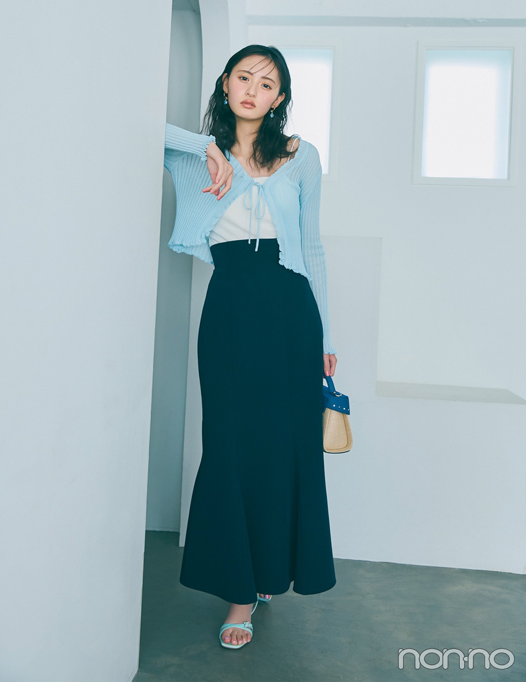 ロンスカの持つ上品さは残しながらも、キャッチーな短丈カーデでトレンドも意識。淡い水色の効果で、甘く爽やかな雰囲気に。足元はサンダルで"抜け"を作って。