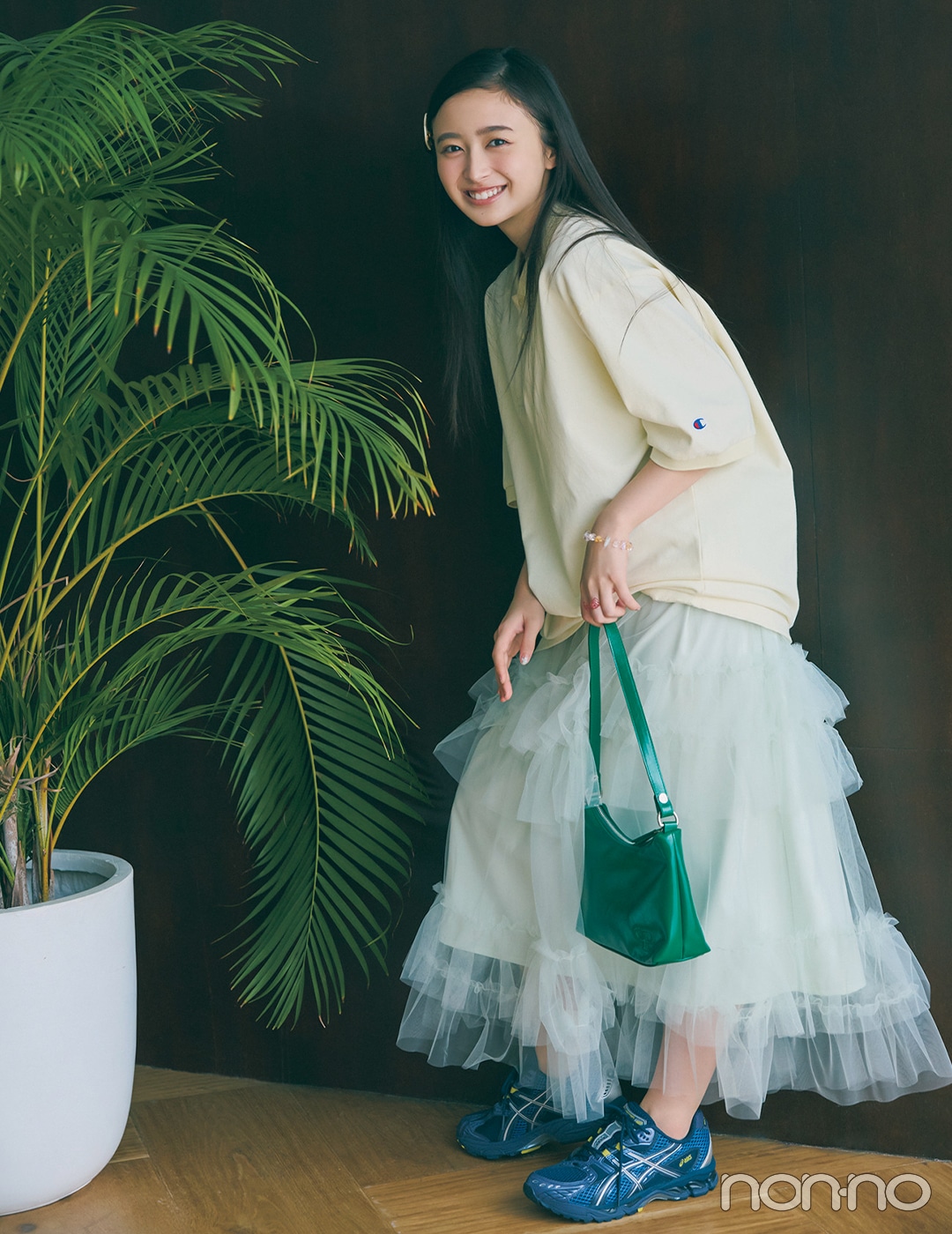 トップス¥8800/ヘインズブランズ ジャパン カスタマーセンター(チャンピオン) スカート¥3850/エムズエキサイト バレッタ(2個セット)¥1540/SENSE OF PLACE by URBAN RESEARCH 天王寺MIO店(スメリー) ブレスレット¥5180(Boite de maco)・リング(パールリングつき)¥3200(しばくま)/ロードス バッグ¥19970/HANA KOREA(クリスティーンプロジェクト) 靴¥22000/アシックスジャパン カスタマーサポート部(アシックス)