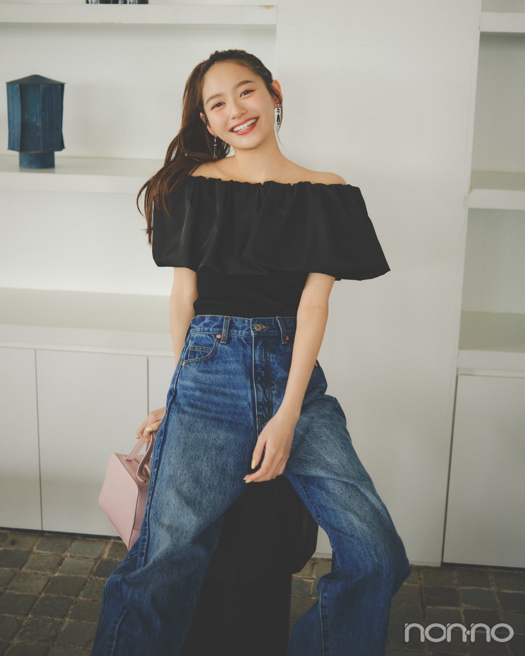 ボディ部分はフィット感のあるリブ素材、フリル部分は立体感をキープするハリ素材。フリルのボリュームを際立たせることで、気になる二の腕もおしゃれにカバー。大胆に肩を見せている分、ハイウエストデニムでカジュアルダウンするのが正解。