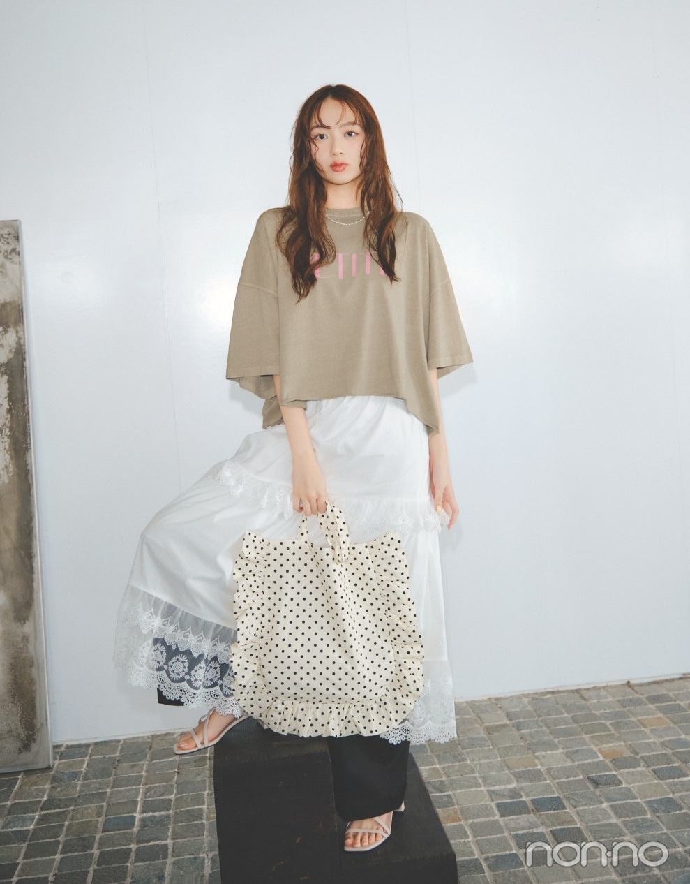 ベージュ地にピンクのロゴが愛らしいTシャツは、ゆとりある身頃と長めの袖丈で二の腕だけでなく上半身全体がきゃしゃに見える。クロップト丈だからボリュームが出すぎず、レーススカート×パンツの旬レイヤードとも好バランス。