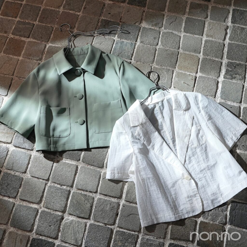 夏の定番アイテム、半袖ジャケット。先に向かって広がるゆとりある袖幅との対比で、腕がほっそり見える優れもの。コンパクトなクロップド丈を選び、全身バランスをのっぺりさせないのもポイント。