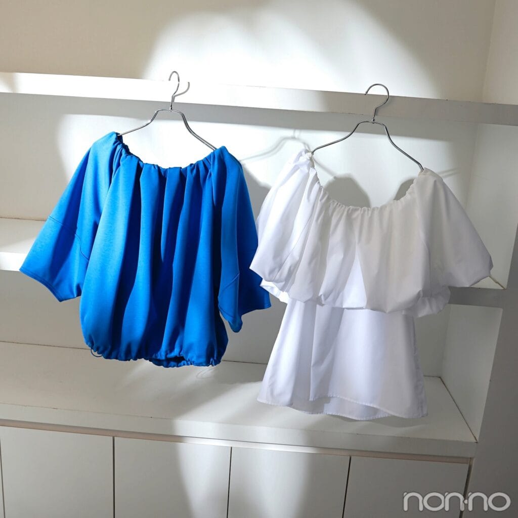 “オフショルトップス”は肩に視線を誘導するから二の腕が目立たない