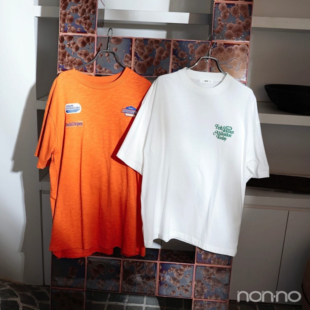 (右)胸元にグリーンのワンポイント入り。広めの身幅と首元を詰まりぎみに仕上げたメンズっぽいたたずまいがしゃれた夏カジュアルに導く。(左)日差しに映えるオレンジTはムラのある生地感でヴィンテージのような味わいに。フロントの3つのロゴ刺繍も二の腕から目線をそらす効果あり。