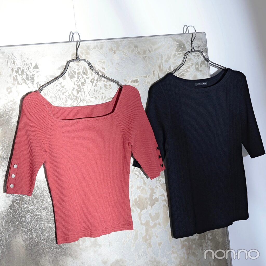(右)暑い季節でも心地よく着られるさらっとした肌ざわりの一着。太さを変えたランダムリブは、より二の腕から視線を外す効果も。”GU”ならではのプチプラも嬉しい。(左)袖にゴールドボタンをあしらった上品トップス。甘め派さんは、やや深みのある暖色を選ぶと引き締まって見える。広めのスクエアネックで小顔効果も。