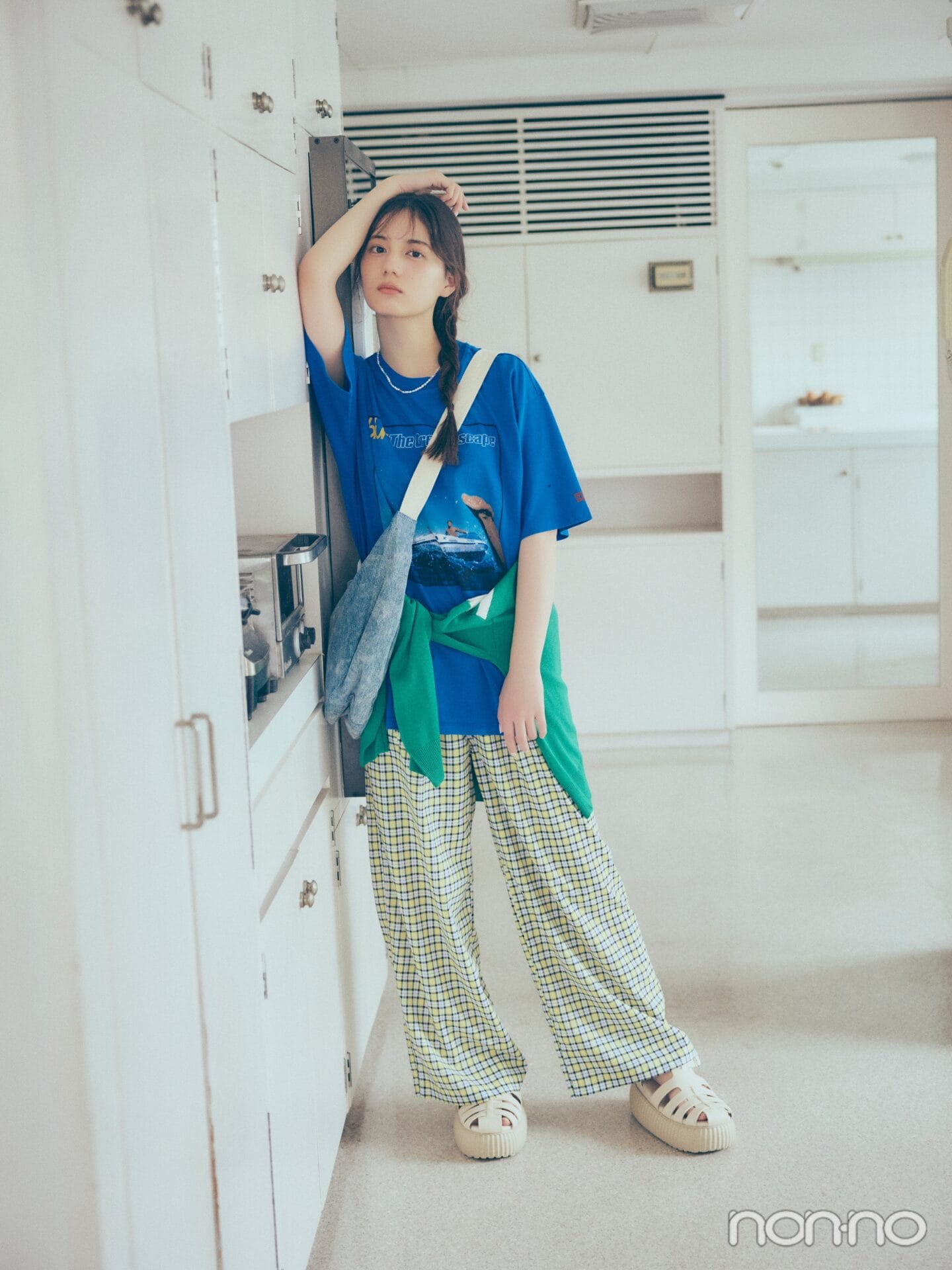 ノンノモデル・小坂菜緒のいろんなTシャツ姿が見られる毎日更新企画。今日は鮮やかブルーのオーバーサイズTシャツを着こなしてもらいました♪