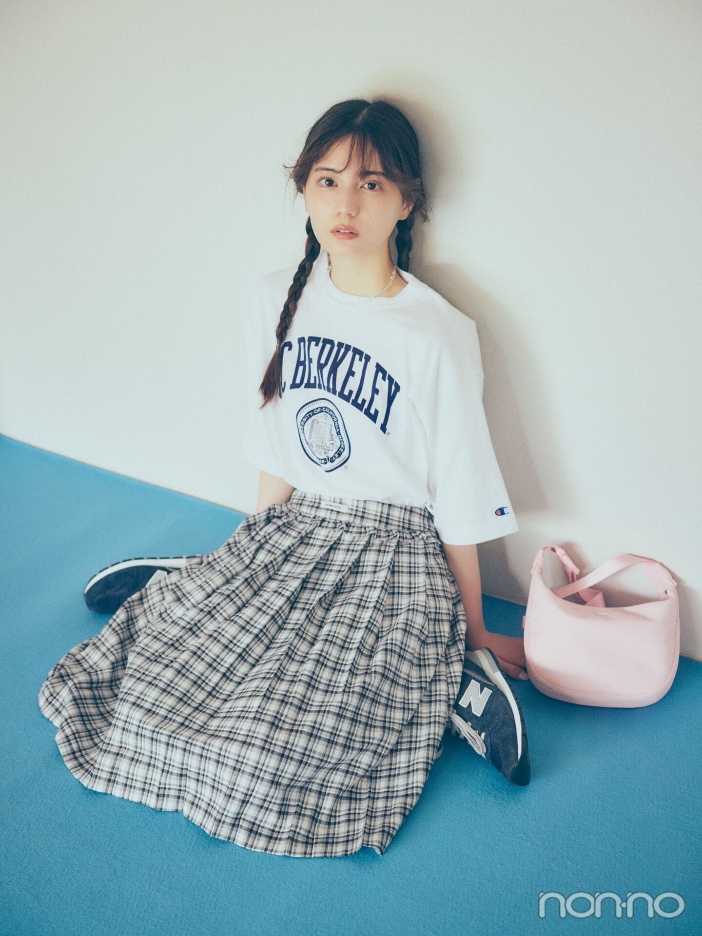 ノンノモデル・小坂菜緒のいろんなTシャツ姿が見られる毎日更新企画。今日は、気負わず着られる「カレッジロゴTシャツ」。ゆるんとカジュアルなこさかなです。