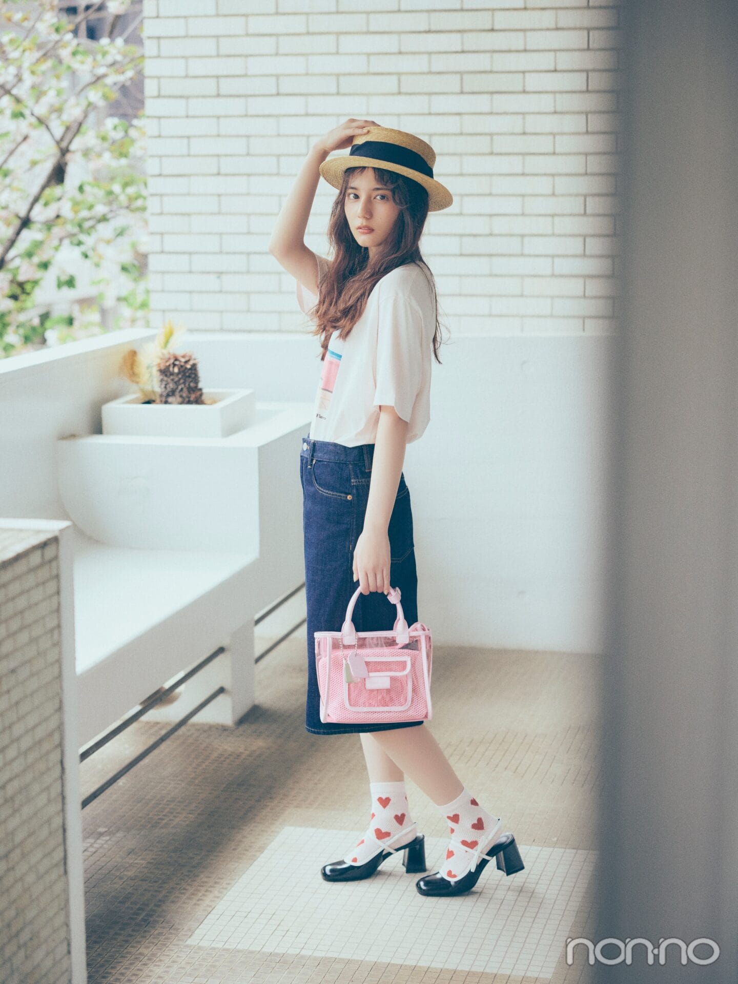 ひざ丈のデニムパンツ&カンカン帽の夏コンビに、クリアバッグやハートのソックスとチアフルな小物をちりばめて。Tシャツのピンクをキーカラーにした個性ある着こなしに!