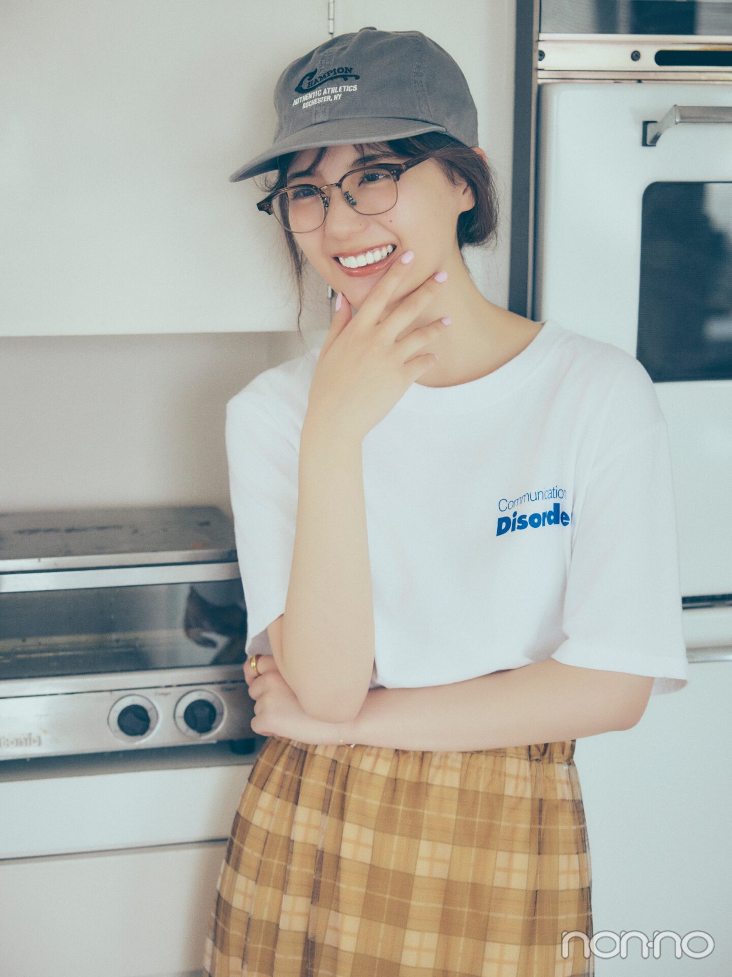 ノンノモデル・小坂菜緒のいろんなTシャツ姿が見られる毎日更新企画。キャップとメガネを合わせた、いつもとひと味違うこさかなをご覧あれ!