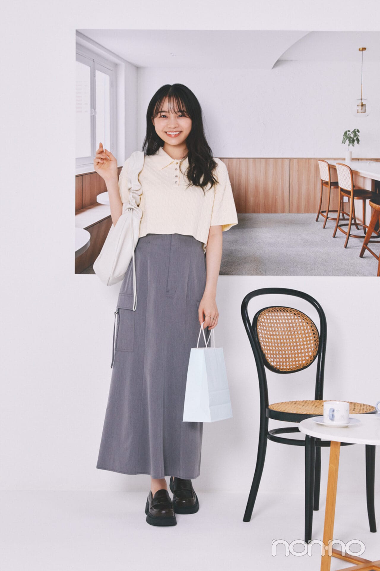 きれいめベースの衿つきニットは、たまごイエローや五分袖といった可愛げデザインをチョイス。端正さを意識して上までボタンを留めるのが、愛され後輩ムードにぴったり。スラリとしたシルエットのカーゴロンスカ合わせですっきり着やせ効果も。厚底ローファーでさりげなくスタイルアップしつつ、きちんと感も引き寄せて。