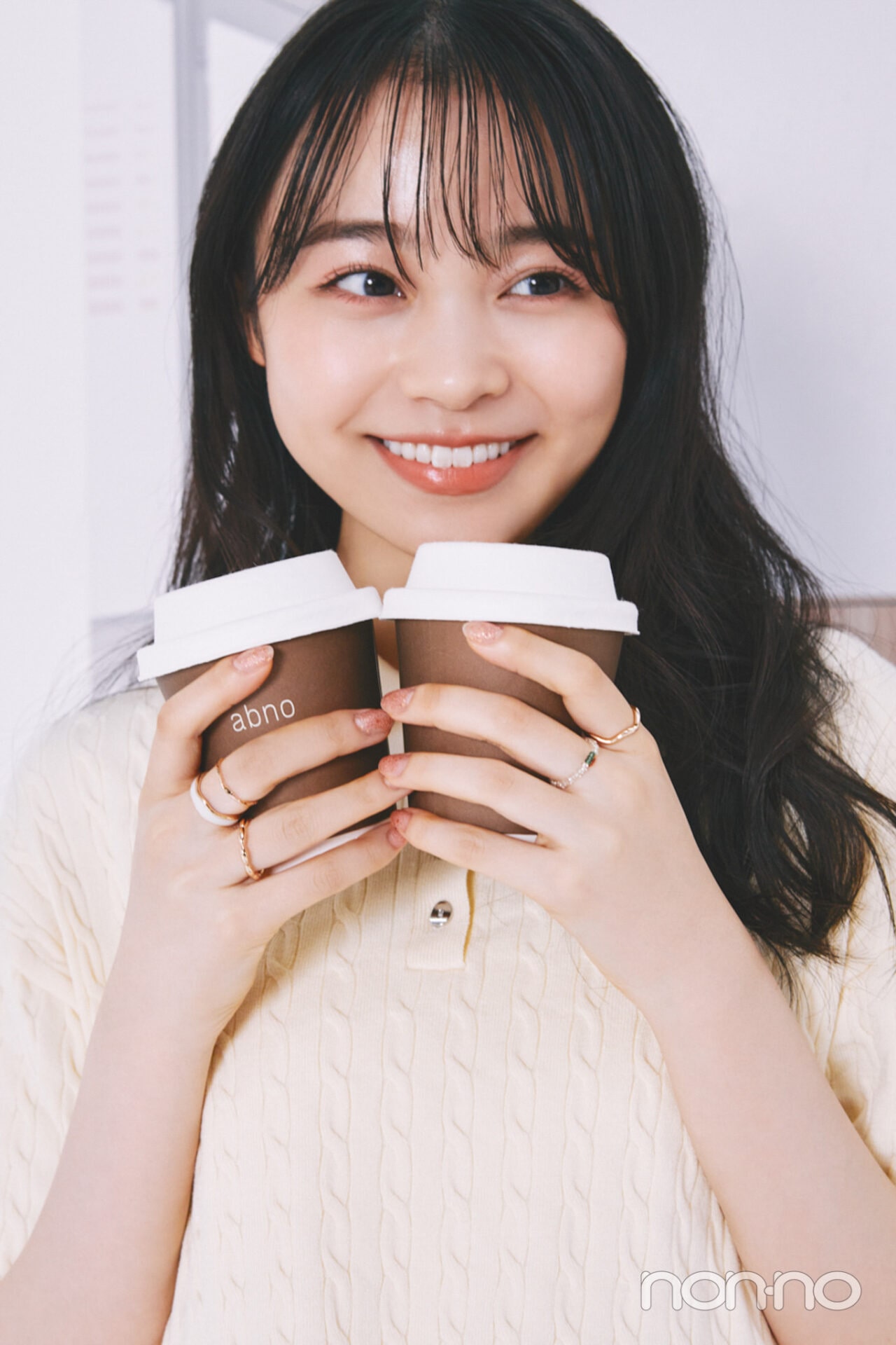 きゃしゃなゴールドリングを重ねつつ、ビーズリングで涼しげな印象を。遊び心のある組み合わせが、衿つきニットの真面目さにちょっとしたしゃれ感をプラスしてくれるよ。