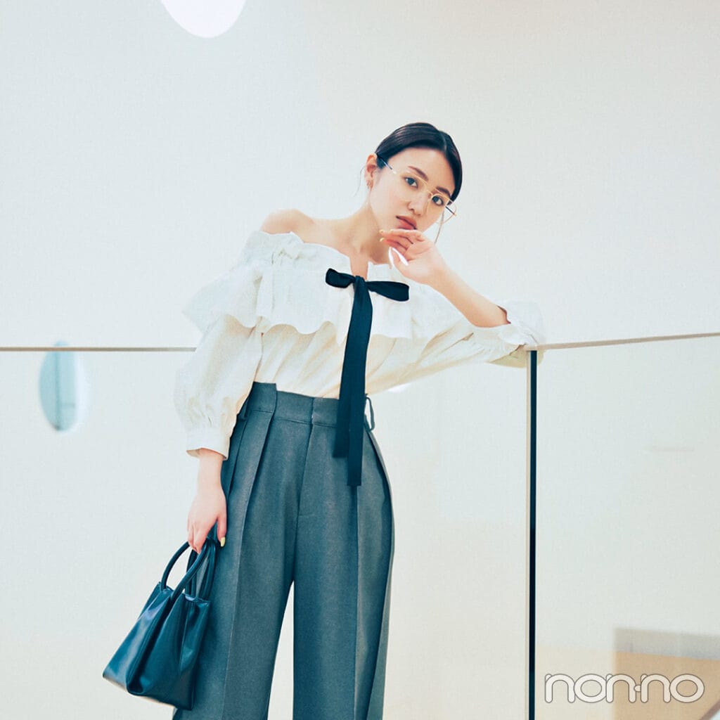 ブラウス¥6050/KBF ルミネエスト新宿店 ワンピース¥7148/ワールド プレスインフォメーション(グローブ) パンツ¥7491/ROPÉ PICNIC 傘¥2860/ワールドパーティー(Wpc.)イヤリング¥4730/サンポークリエイト(mimi33) ブレスレット¥1980/お世話や(OSEWAYA) バッグ¥14300/Firsthand 靴¥6600/ダブルエー(オリエンタルトラフィック)