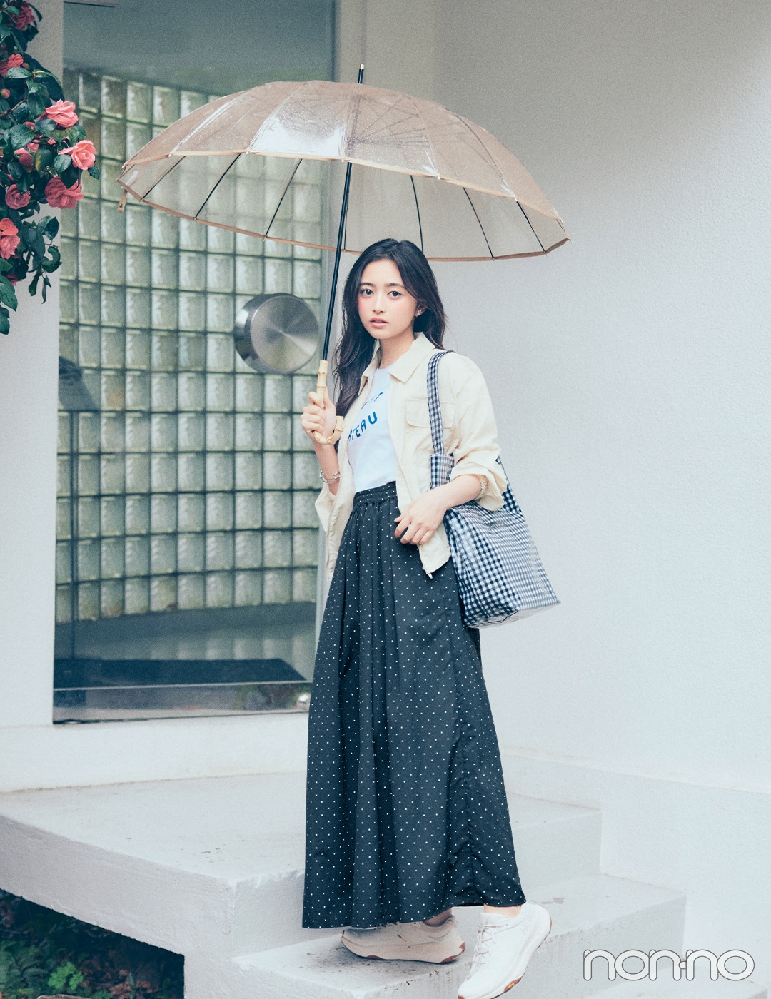 雨降る月曜日は、機能性アイテムでまとめたスタイリングで登校。ボリューミーなシルエットと細かめドットが華やかなロングスカートは、撥水仕様で雨の日でも快適! 撥水ブルゾンを合わせれば、肌寒い日の寒暖差対策にも◎