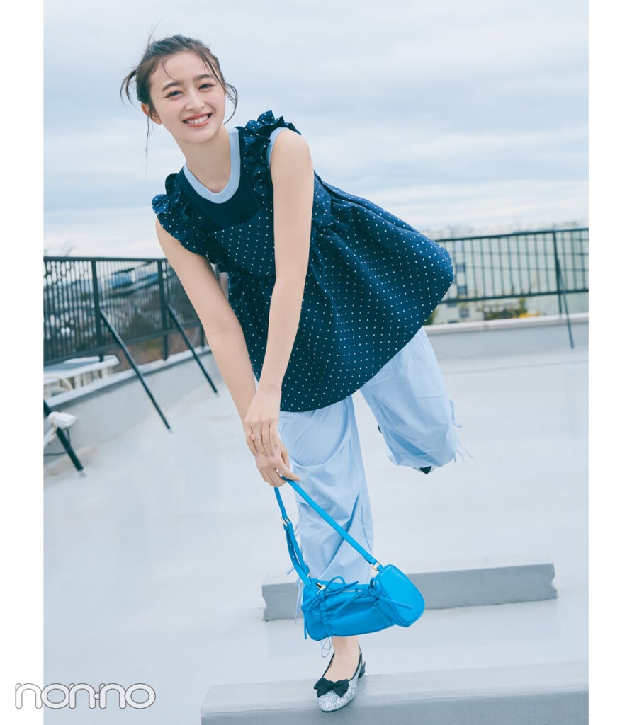 弾丸旅行2日目は、清涼感溢れるミニスカコーデで食べ歩き♡ ネイビーならではの端正な雰囲気になるポロニットには、あえてブルーのシャツを忍ばせた"衿on衿"のレイヤードで旬な味つけを。プリーツのミニスカを合わせて、コーデに立体感をプラスして♡