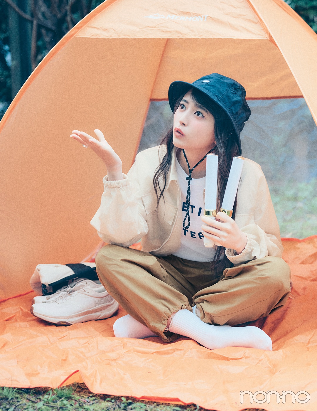 ブルゾン¥7920/クロスプラス(for/c) Tシャツ¥6270/フリークス ストア渋谷(プチバトー×フリークス ストア) パンツ¥16500/N.O.R.C 帽子¥4290/キーン・ジャパン(キーン) リング¥2900/ロードス(kokosora) 靴下¥1100/Tabio(靴下屋) バッグ¥3850/ワールドパーティー(ONDOO by Wpc.) 靴¥22000/デッカーズジャパン(ホカⓇ)
