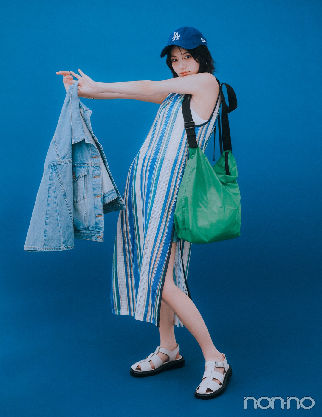 端正なストライプより、ポップなマルチストライプに気分がアガるこれからの季節。メッシュ素材やスリットなど、風通しのいいデザインのワンピースがチルな気分を連れてくる。こんなコーデでお出かけしたいのはもちろん海!
