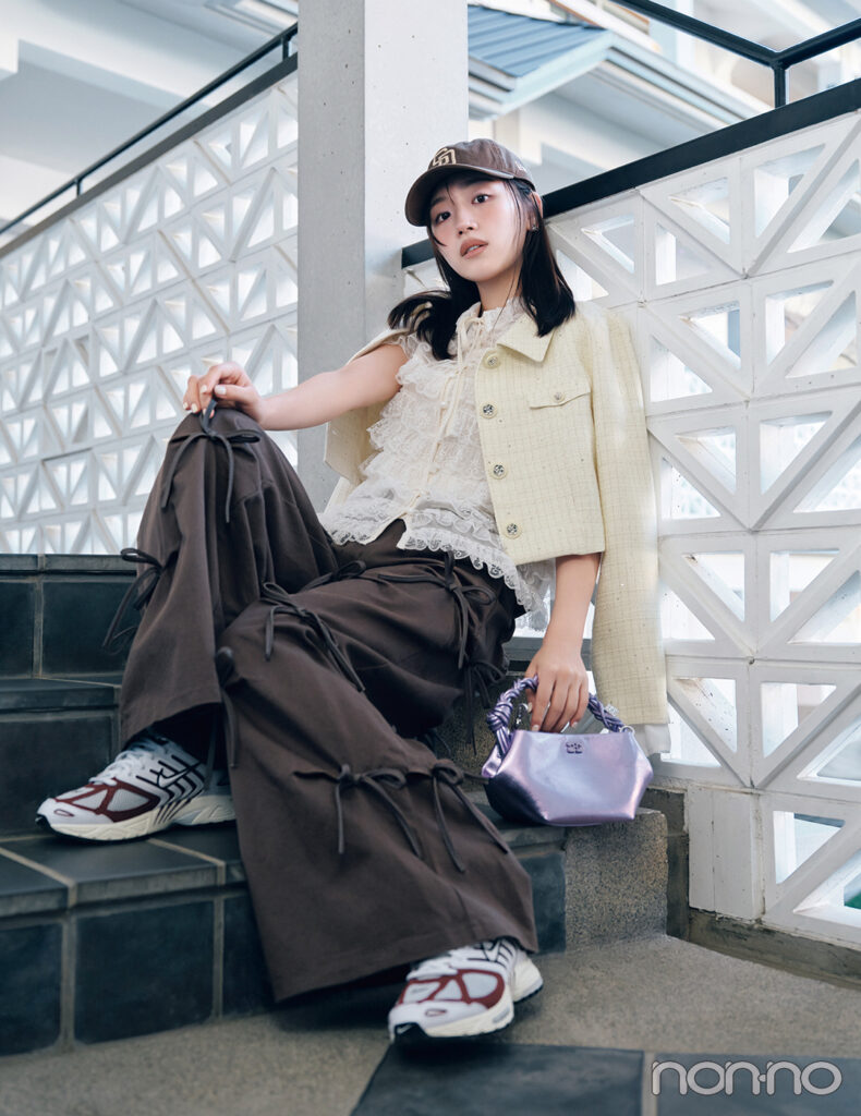 ジャケット¥13750/dazzlin トップス¥16500/ガールズソサエティ パンツ¥14300/Darich 帽子¥4400/OVERRIDE 神宮前(ニューエラ) ピアス¥3960/サンポークリエイト(mimi33) バッグ¥67100/GANNI 靴¥21230/NIKE カスタマーサービス(ナイキ スポーツウェア) インナー/スタイリスト私物