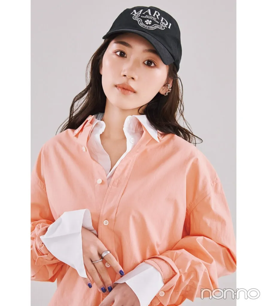 シャツ¥20570/GBH インに着たシャツ¥16000/バナナ・リパブリック 帽子¥6600/マルディメクルディジャパン(マルディメクルディ) イヤカフ¥2200/ロードス(TIGRIS) リング(2個セット)¥1099/WEGO