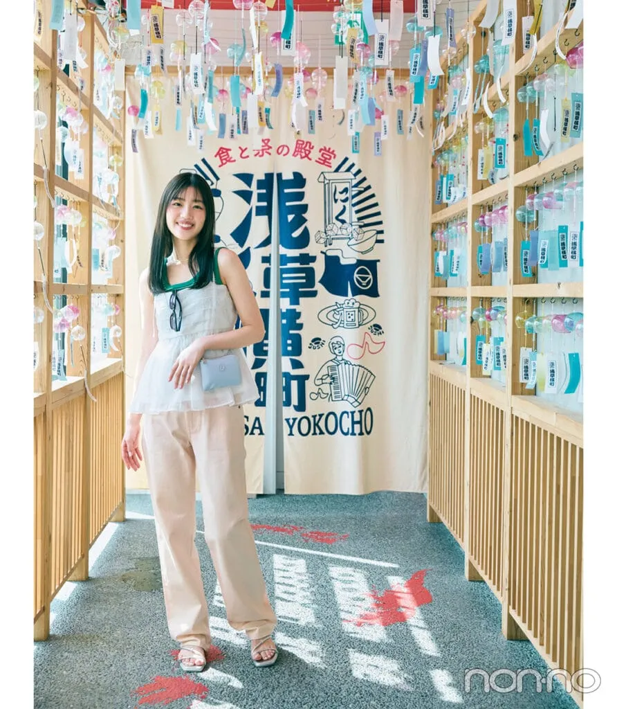 気温が高い日は、ふわっと感が可愛い肩リボンキャミをカラータンクにレイヤードした初夏コーデで出発。フルレングスのパンツは淡いピンクをセレクトして、程よい甘さをプラス♡ 色×色のスタイリングは、白キャミでつなげば簡単になじんでシャレ感もUP。
