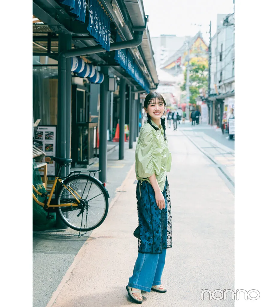 月曜日は、定番のデニムコーデに涼やかなレースの巻きスカートをひと巻きしたカジュアルコーデで登校♪ トップスは袖のシャーリングデザインが目を惹く明るいミントグリーンのシャツをON。遠くから見てもぱっと華やかな存在感抜群のスタイリングに。