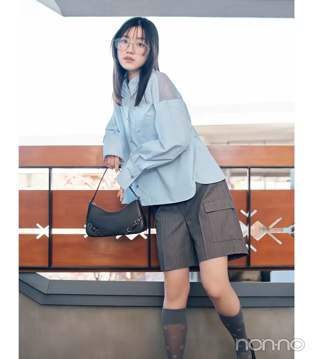 金曜日は、ミリタリーライクなビッグポケットがポイントのカーゴハーパンで登校! きちんと感のあるブルーのシャツでハンサムにまとめれば、マニッシュ×ストリートの融合で新鮮見えするコーデに。足元はハーフパンツと同系色のシアーソックスを取り入れて、涼し気な雰囲気を保ちつつ露出を調整♪
