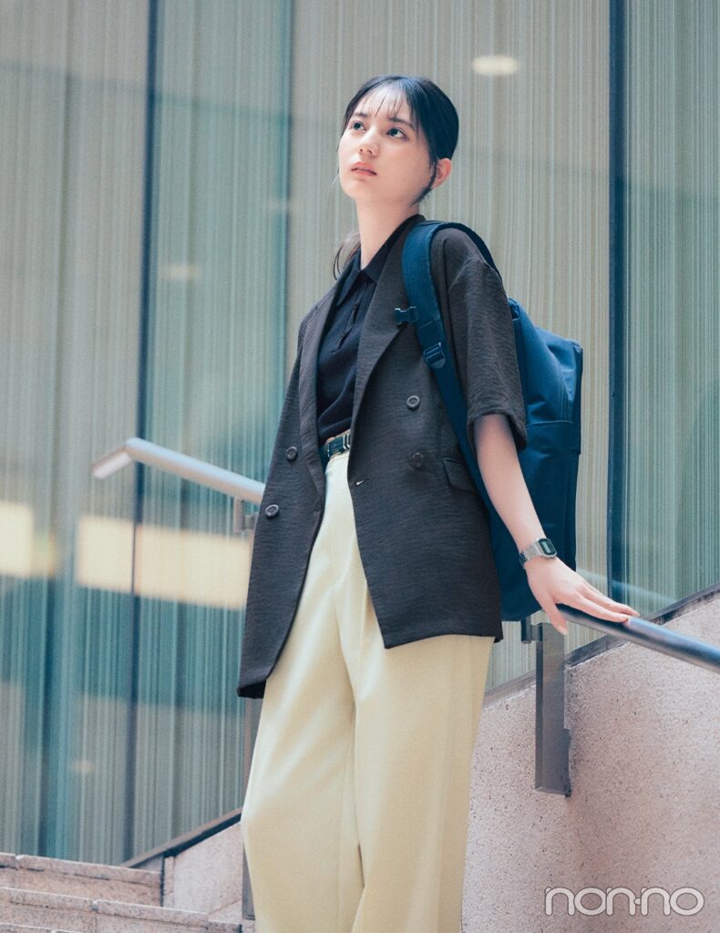 第3位は5月30日に公開された小坂菜緒のコーディネート。オフィスカジュアル指定のインターンにもおすすめなきちんと見えスタイル。接触冷感ジャケットと洗濯機で洗えるワイドパンツが夏の強い味方に!