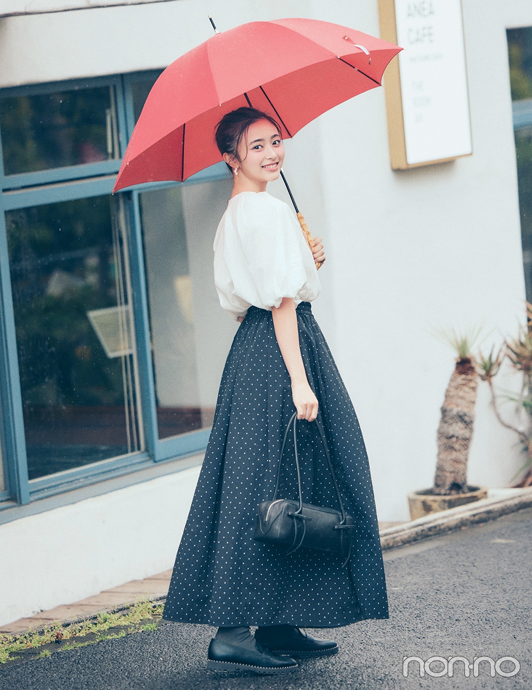 空模様があやしい日は、服のテンションに頼るのが正解。着るだけで気持ちがフワッと華やぐ白のパフ袖ブラウスと、ドット柄のボリュームフレアはどちらも撥水素材。レインシューズと撥水加工のバッグで抜かりなく。