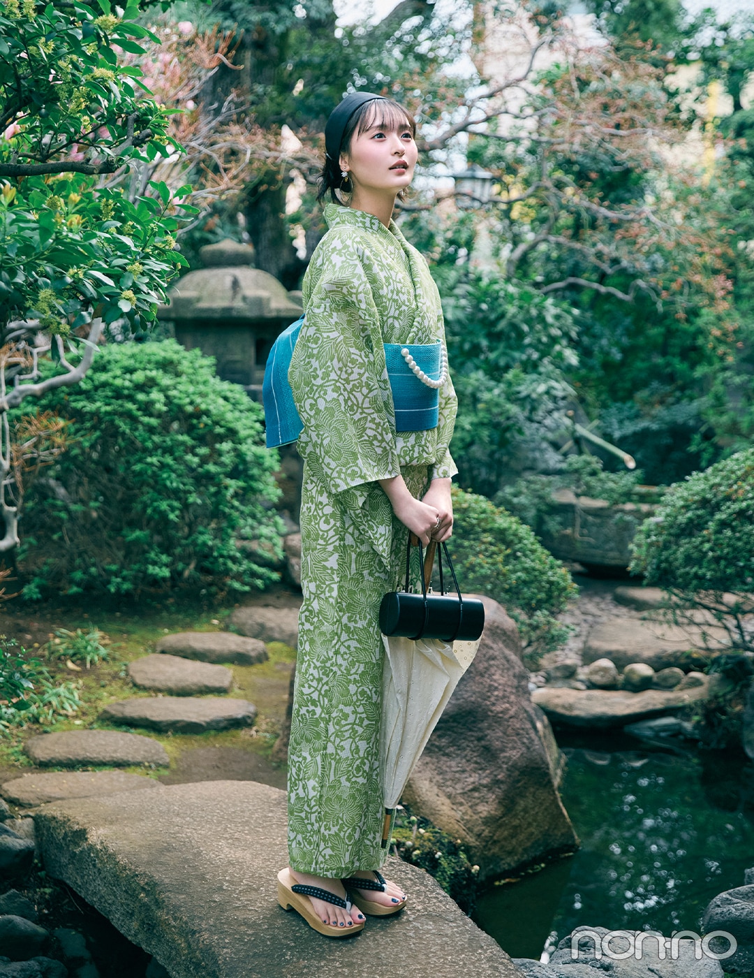浴衣¥137500(反物価格)/竺仙 帯¥25300/荒川(古今) 根付¥7480/ふりふ げた¥14300/三松 ターバン¥23100/THE HAIR BAR TOKYO(LELET NY) イヤリング¥3960/805ショールーム(マチルダローズ) リング¥5500/ロードス(G.R) バッグ¥8990/MANGO 傘¥17600/W A K A O