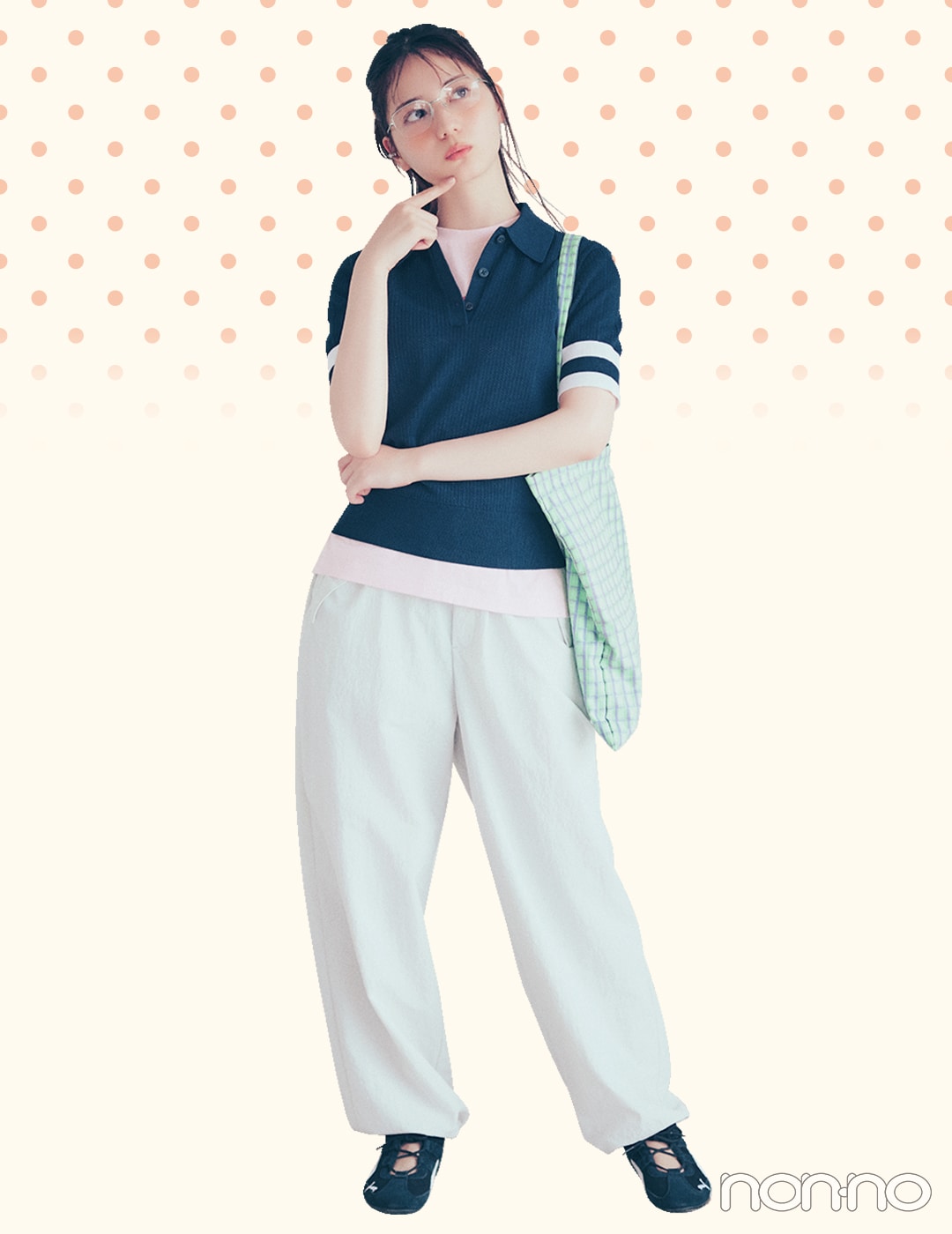 第2位は6月23日に公開された小坂菜緒のコーディネート。トレンド浮上中のきれいめニットポロはパラシュートパンツやスニーカーを合わせてスポーティに着るのが気分。インにピンクのTシャツを仕込んで鮮度UP!