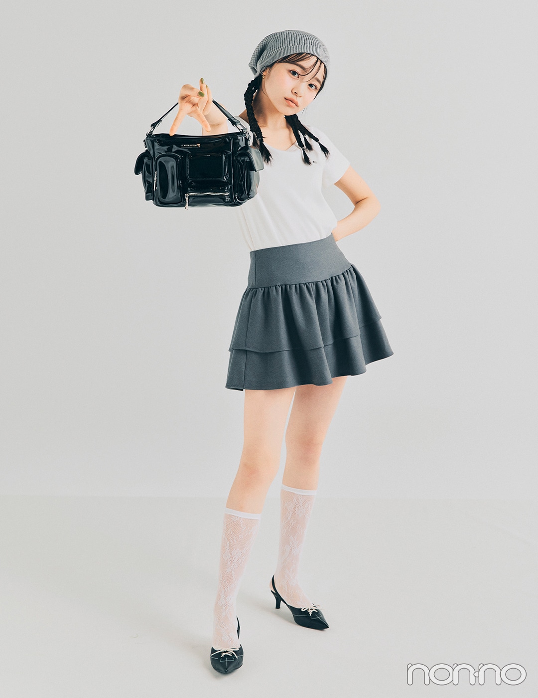 第3位は6月24日に公開された林芽亜里のコーディネート。ティアードミニスカートに定番白Tをあわせるなら身幅も袖もチビTサイズが正解。ワンツーコーデでスタイルアップも叶う最強の組み合わせ!