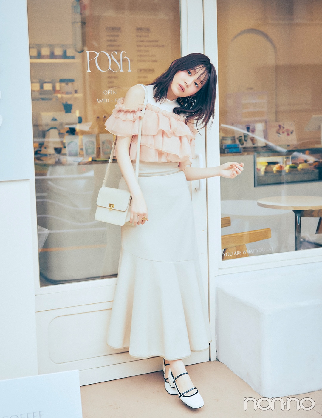第5位は6月25日に公開された久間田琳加のコーディネート。映えカフェでスイーツを楽しむ日はとことんフェミニンに! レイヤードデザインが可愛いトップスを主役に、ピンク×アイボリー配色で上品に仕上げて。