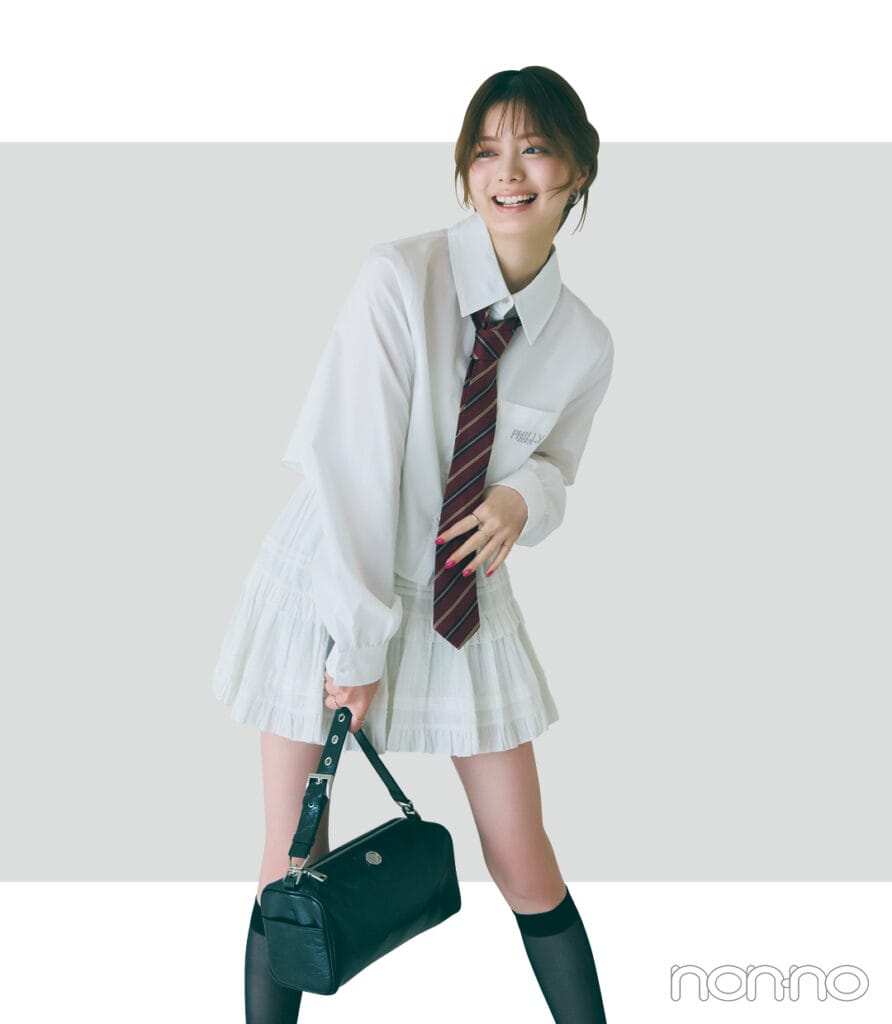 甘めスカートに、シャツ×ネクタイでマニッシュさをMIX。ダークトーンの赤を添えることで、キリッと引き締まり、さらに縦ライン効果で白コーデもすっきり見え。
