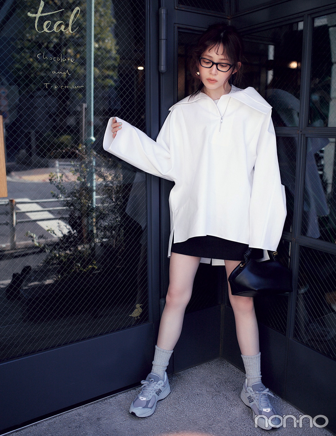 シャツ¥31000/COS 青山店(C OS) Tシャツ¥990/GU スカート¥7990/Gap メガネ¥27280/ルックスオティカジャパン カスタマーサービス(レイバン) ネックレス¥3850/ロードス(ヘンカ) バッグ¥69300(参考価格)/ガニー 渋谷パルコ 靴下¥1210/Tabio(靴下屋) 靴¥19800/atmos pink flagship Harajuku店(NEW BALANCE)