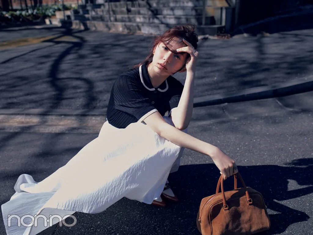 火曜日は、甘さと知性が同居するポロニットに、軽やかな白のフレアスカートを合わせたスタイリングで大学へ。コンサバに見えがちな組み合わせには、ブラウンの靴とバッグでこなれ感をミックス。きちんと感があるコーデなら、集中して講義に取り組めそう♡