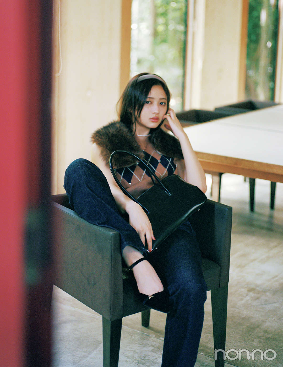 デニムを新たな気分で着こなすならこの秋は“令嬢み”をプラスするのが正解。こっくりブラウンのフェイクファーティペットとベビーパールのショートネックレスで、小物使いはとびきりエレガントに。