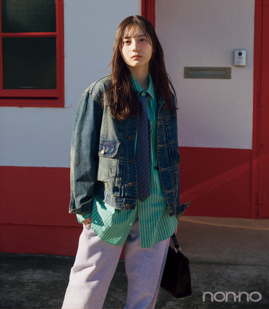 2025年4月号では、ファッション特集に初登場。まずはストライプシャツ×ネクタイのシティガールな着こなしに挑戦♪ ラフでしゃれ感のあるスタイルが抜群にきまってる!