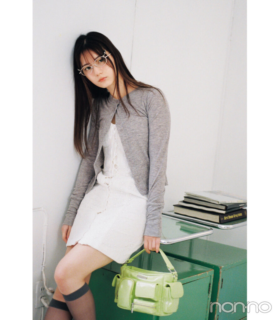 ワンピース¥22000/ガールズソサエティ カーディガン¥3300/アンティローザ(HANNE) ヘアピン(2本セット)¥1760/サンポークリエイト(アネモネ) メガネ¥30910/ユー バイ スピック&スパン ルミネ池袋店(OROR) バッグ¥16500/サントラージュ(アナ スイ エヌワイシー) 靴下¥1210/Tabio(靴下屋)
