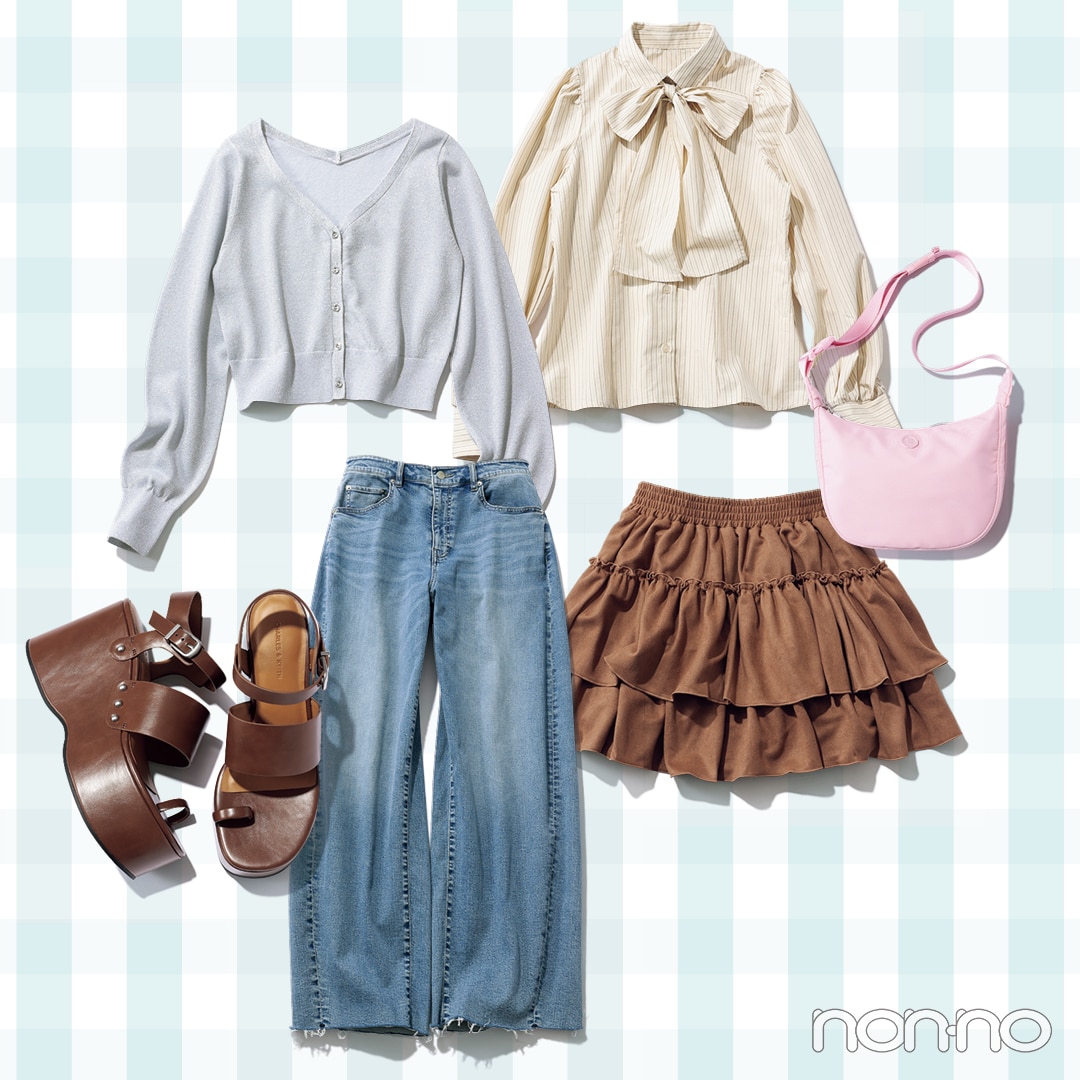 ブラウス¥3600/コーエン ジャンパースカート¥12500/ROSE BUD 新宿店 イヤカフ¥1500(3つセット)/アダストリア(ミィパーセント) バッグ¥12000/アンビリオン(ペルケ) 靴¥5900/ダブルエー(オリエンタルトラフィック)
