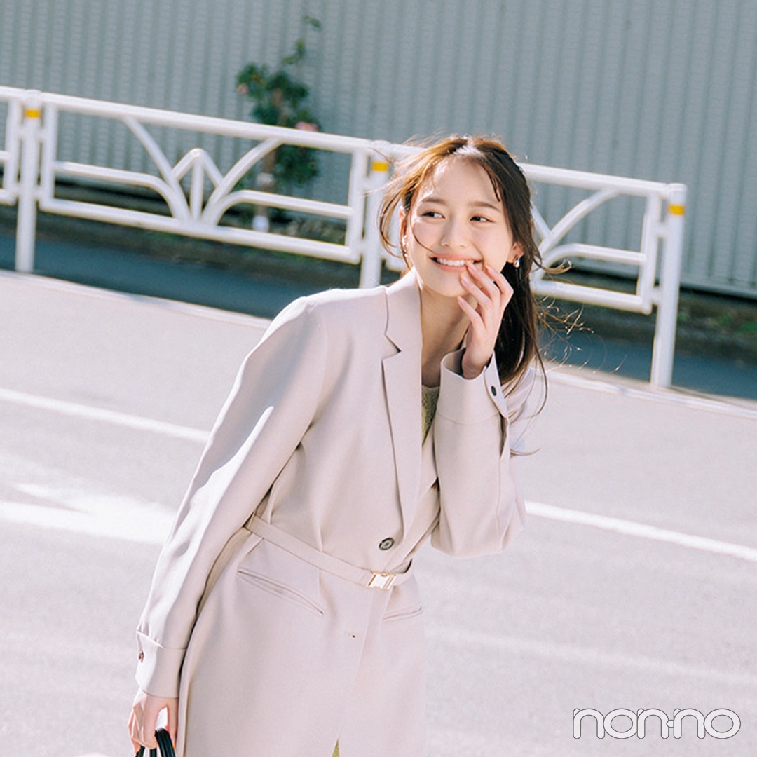 ジャケット¥21000/ユー バイ スピック&スパン 渋谷パルコ店 ワンピース(インナーつき)¥18000/ココ ディール(ココ ディール リュクス) パンツ¥23000/ゲストリスト(アッパーハイツ) シュシュ(白)¥990・シュシュ(緑)¥800/アダストリア(ミィパーセント) 靴¥12000/コンバースインフォメーションセンター