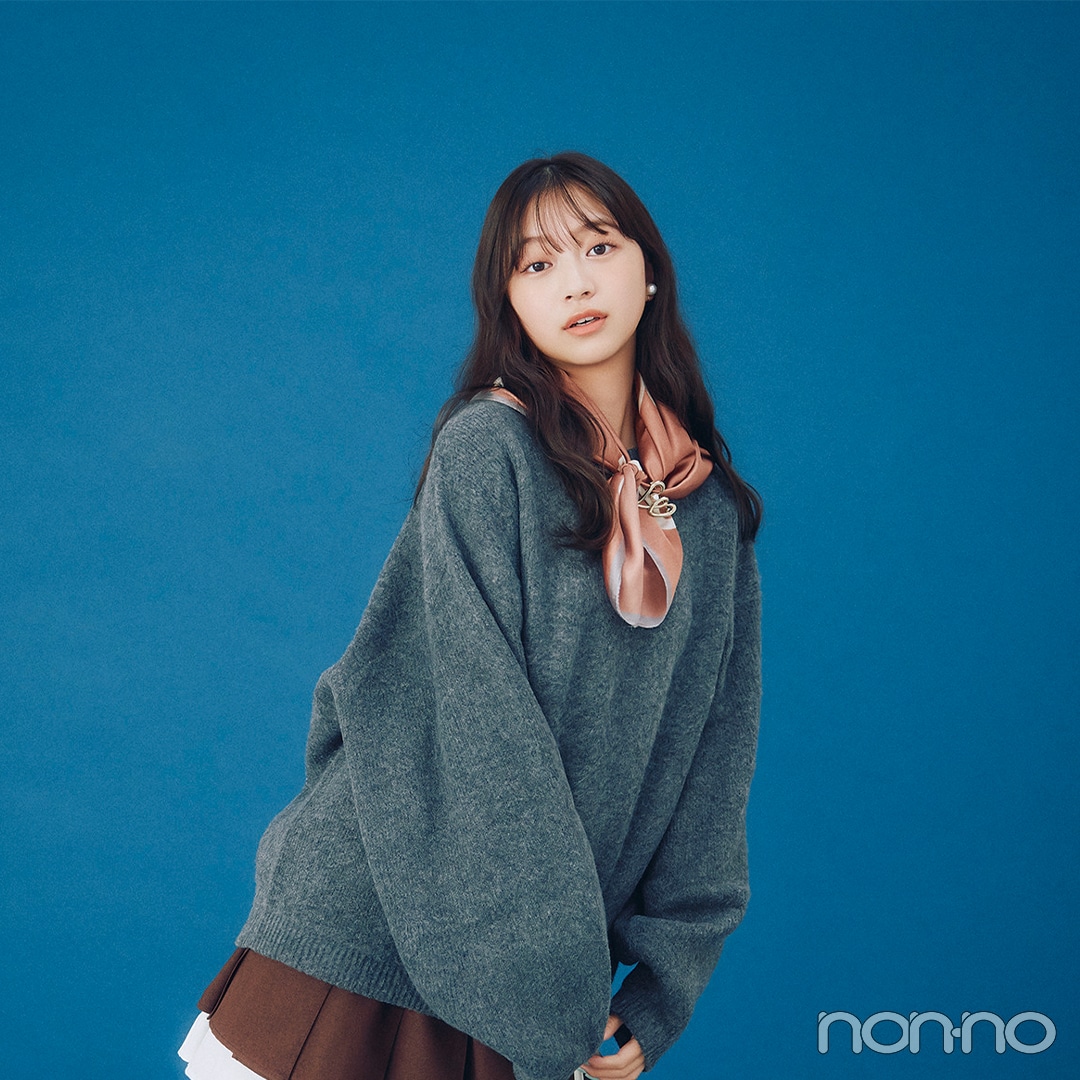 スカーフの上品なツヤでゆるニットが一気に大人っぽく【大学生の毎日コーデ】