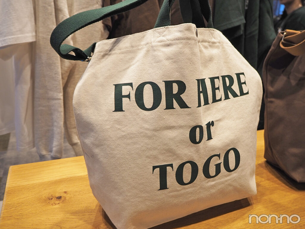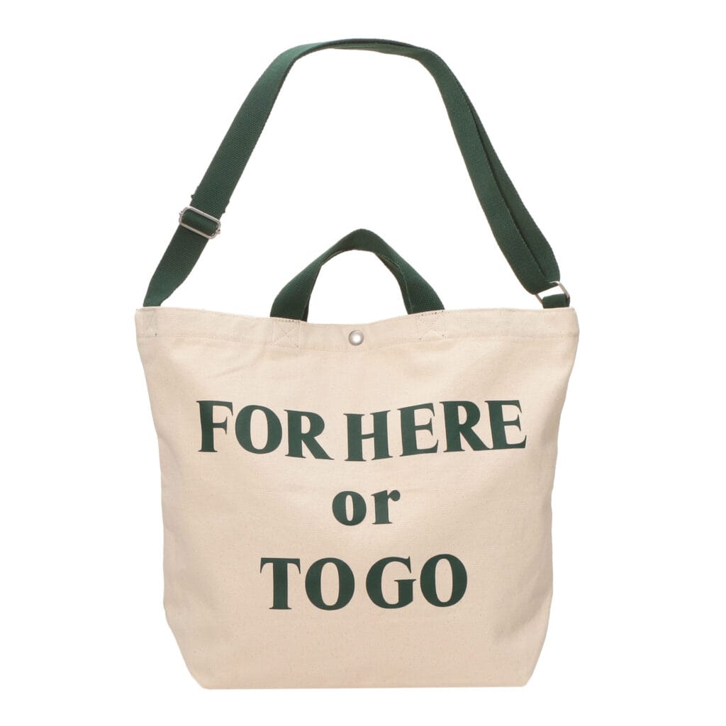 スターバックスでオーダーする際のフレーズ、“FOR HERE OR TO GO”(店内をご利用されますか? お持ち帰りされますか?)がプリントされたユニークなバッグ。