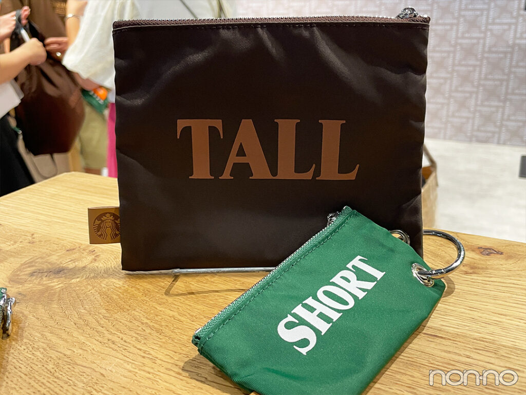 薄くて軽量なポーチが、大小サイズ違いのセットに。大きい方にはスターバックスのドリンクサイズ“TALL”を、小さい方には“SHORT”のロゴ入り。シルバーリングは開閉可能で、パンツのベルトループに通してキーホルダー感覚で使っているスタッフさんも! バラつきがちなガジェット類を収納しておくのもよさそう。