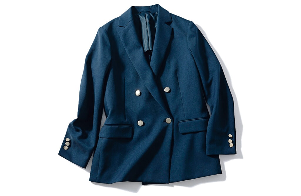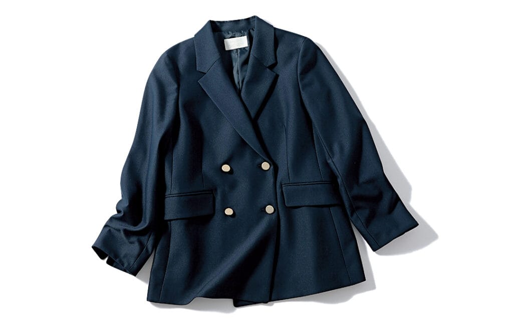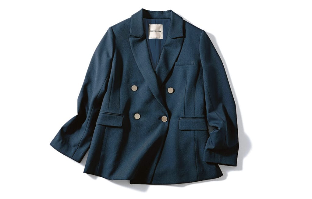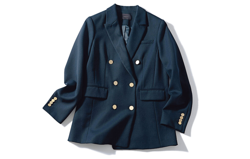 シャープできりっとしながらも黒よりカジュアルな印象になるネイビーのブレザーは、きちんと感が程よく出せる万能ジャケット。クラシカルな印象に仕上がるジャストサイズ+メタルボタンつきが推し!