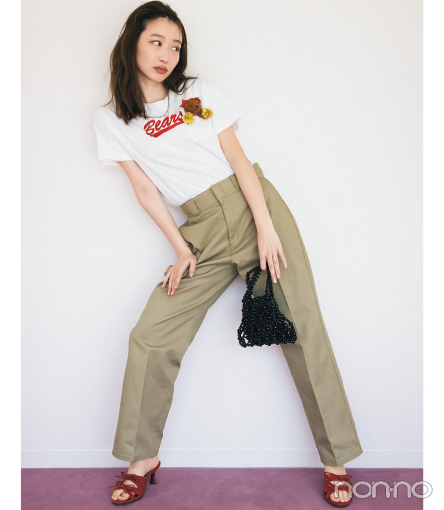 Tシャツ¥27500/エンケル(ダブレット) パンツ¥13750/シップス インフォメーションセンター(シップス エニィ×ディッキーズ) カチューシャ¥990/お世話や(OSEWAYA) ネックレス(2本セット)¥590/GU バッグ¥4499/ROPÉ PICNIC PASSAGE 靴(5月発売予定)¥13200/リゼクシー