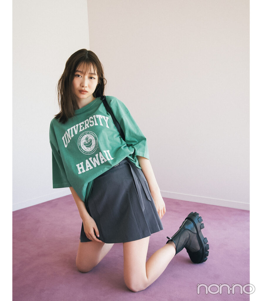 Tシャツ¥6820/GOOD ROCK SPEED ©Licensed by the University of Hawaii スカート¥9790/dazzlin イヤカフ¥1210・リング(5個セット)¥1760/お世話や(OSEWAYA) バッグ¥14850/シップス インフォメーションセンター(スタンドオイル) 靴¥19800/COEL